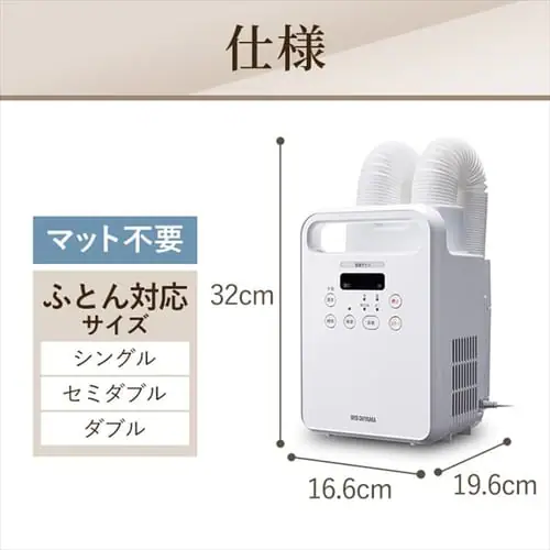 最大の特徴は、マット(袋)を使わず、2本のノズル(ホース)を布団に差し込むだけで乾燥できる手軽さです。