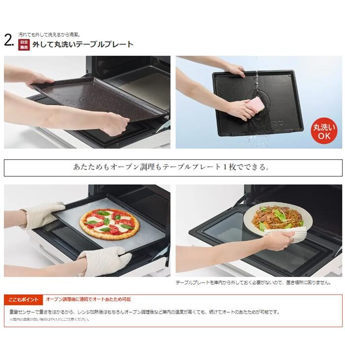 - ラク旨グリル(モデルによる):グリル皿を使い上下同時加熱で一気に焼き上げ。