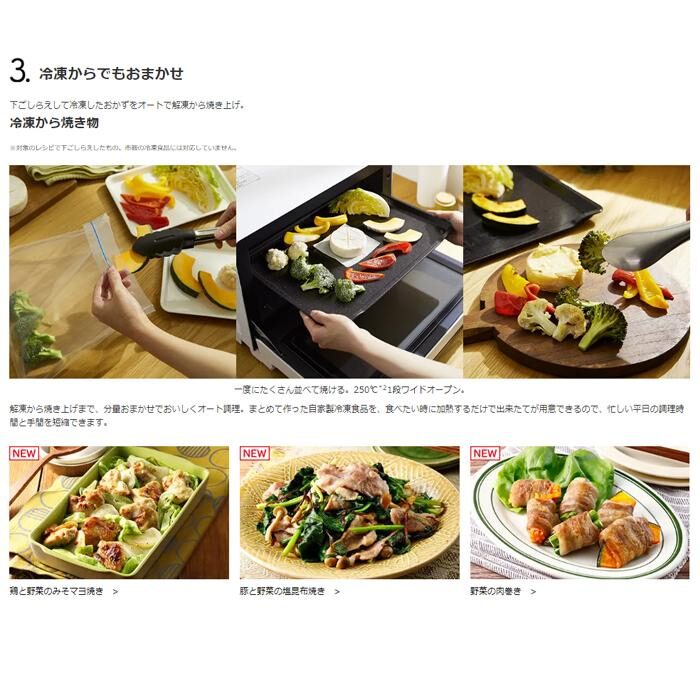 これらの機能によって、温めや焼き、ノンフライ調理など幅広いレパートリーが実現でき、ヘルシーかつ時短につながる調理をサポートします。
