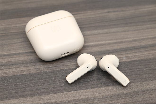 デザインは、ゼンハイザーらしい洗練されたミニマリズム。特にこの「クリーム」カラーは、肌なじみが良く、ファッションやシーンを選ばない上品な佇まいです。充電ケースも、シャツのポケットにも収まるほどコンパクトに設計されており、スマートに持ち運ぶことができます。